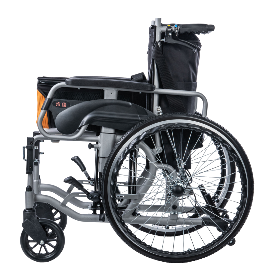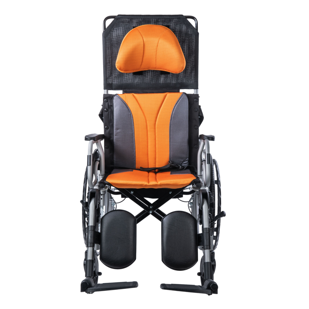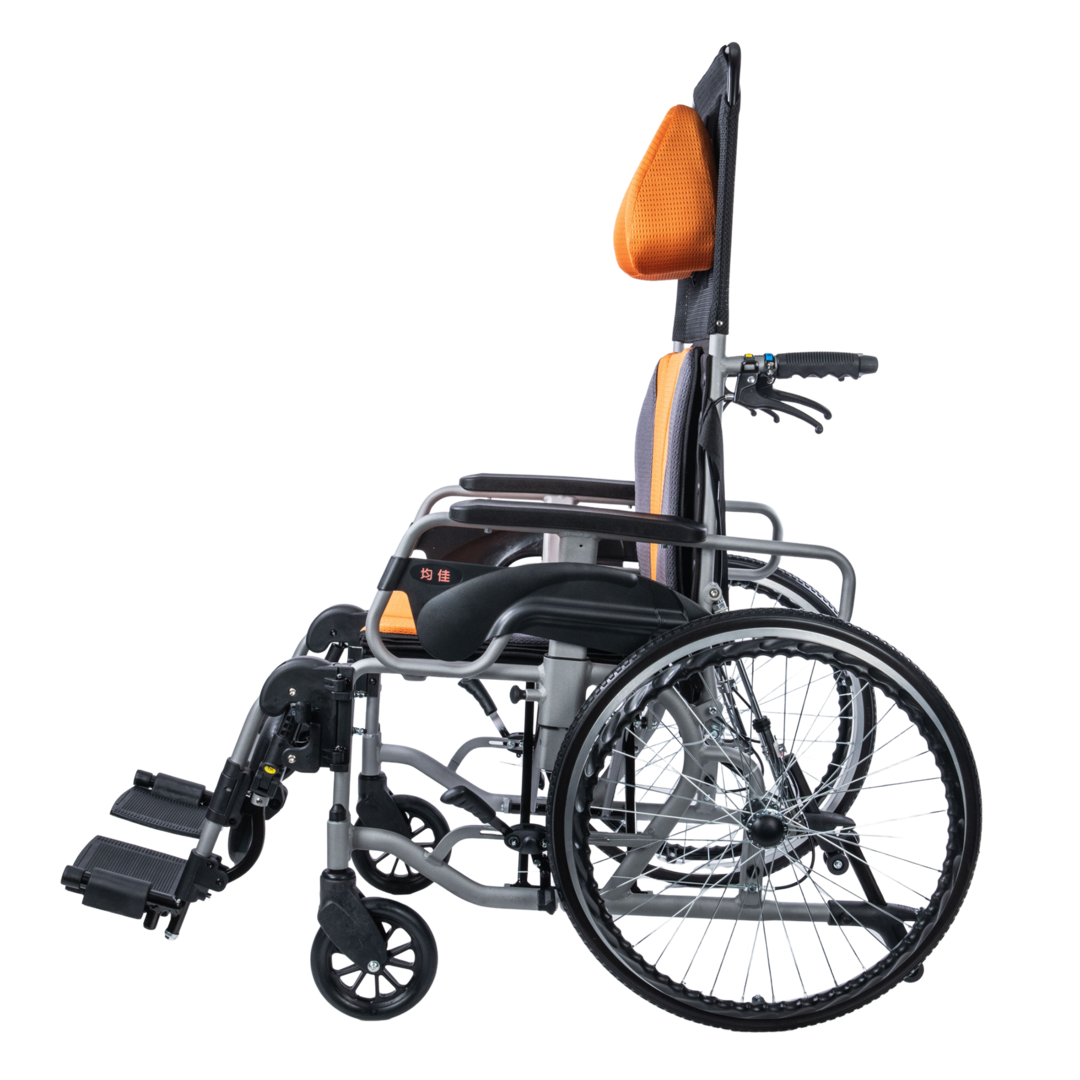 High-back wheelchair with anti-backward orthopedic tripod.